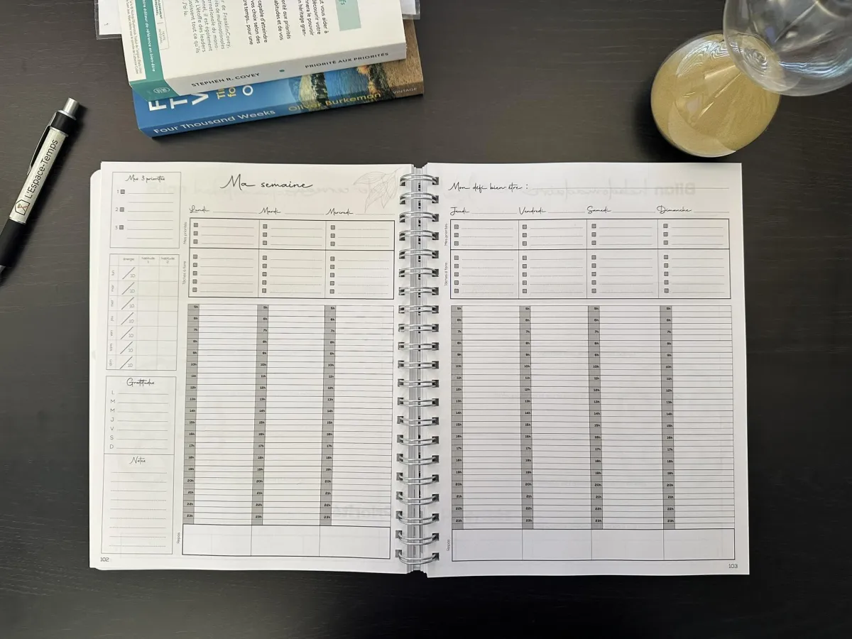 C'est un agenda pour te permettre de clarifier tes pensées et idées et te guider dans la priorisation de tes tâches. C'est un agenda pour t'accompagner vers l'atteinte des objectifs qui te tiennent à coeur afin de t'épanouir dans la vie qui est la tienne.