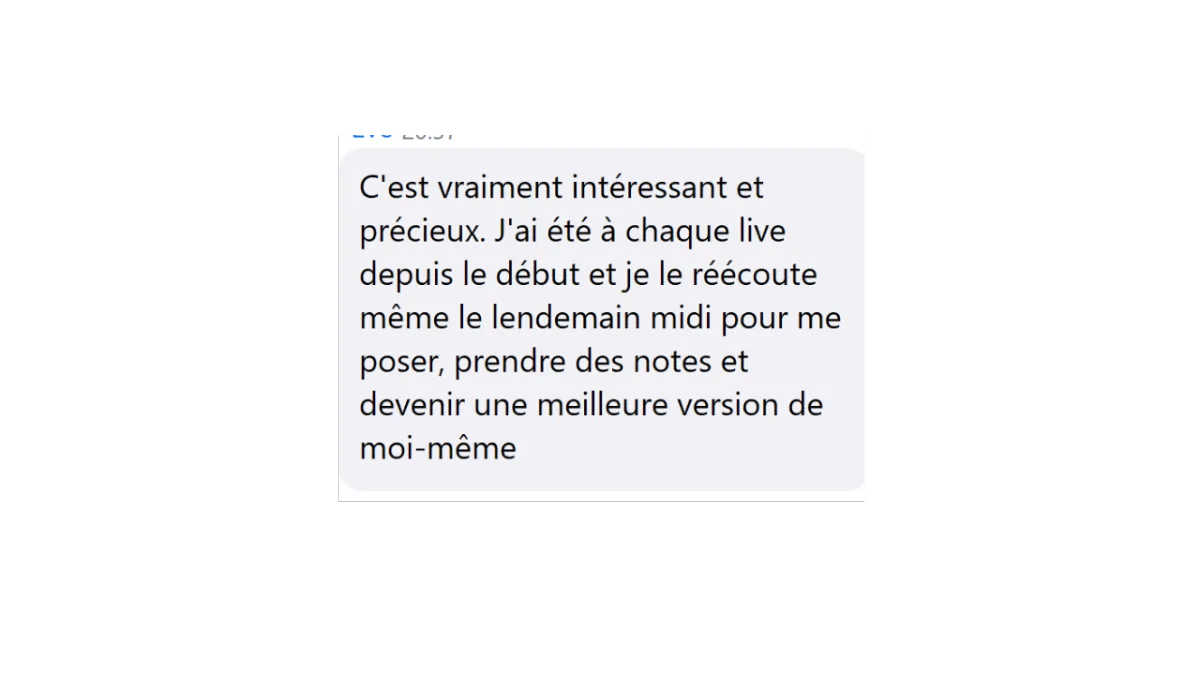 Chaque soirée seras enregistrée et tu recevras un accès temporaire aux replays. Je t'encourage toutefois à être présente en direct pour vivre pleinement l'expérience.